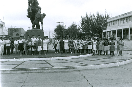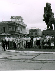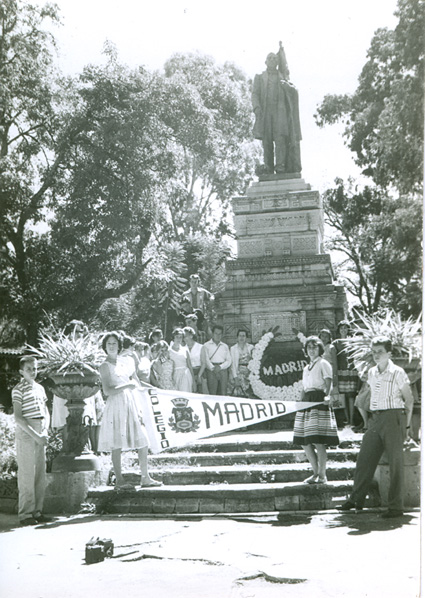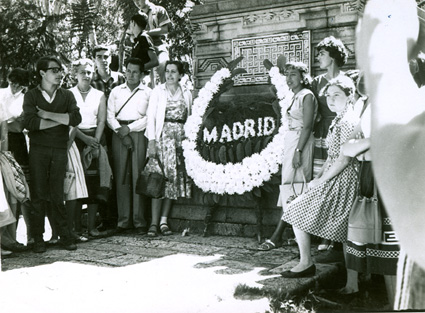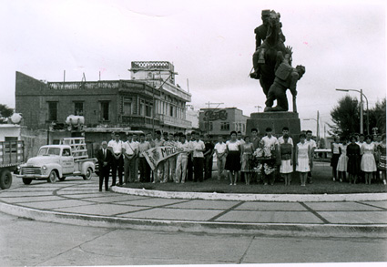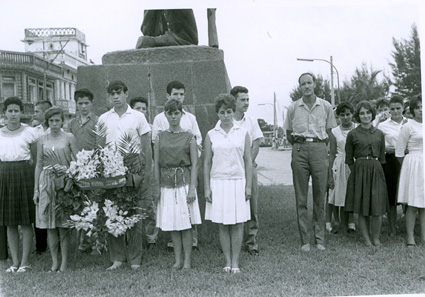 1961Grupo de chicos poniendo una ofrenda florar a lo pies de un monumento. Acompañados del maestro Eduardo Gorraéz.