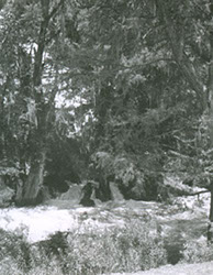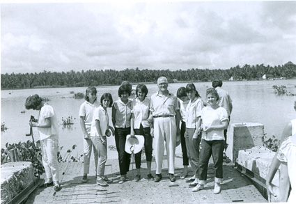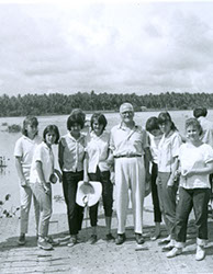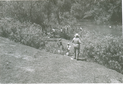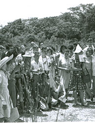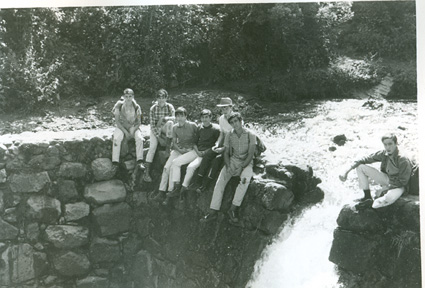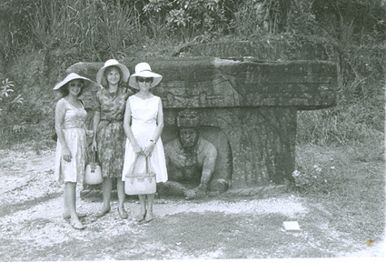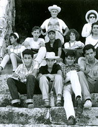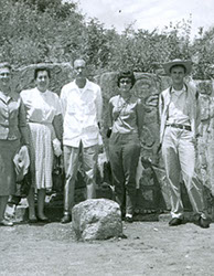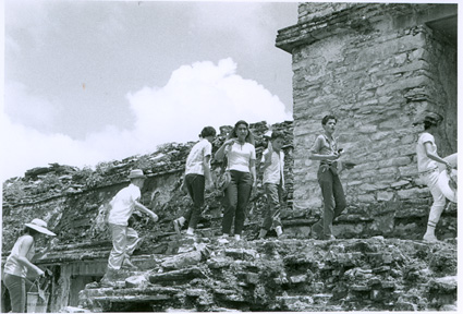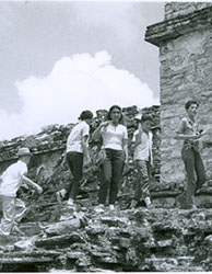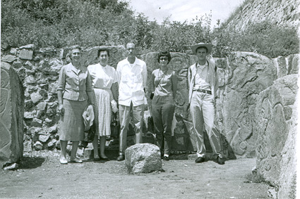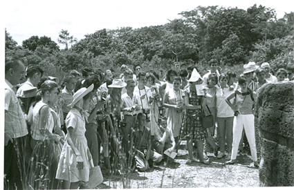 1960Grupo de alumnos observando un agujero en unas ruinas prehispánicas.
