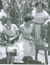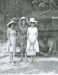 1961Tres chicas fotografiadas delante de una construcción de piedra, posiblemente es prehispánica.