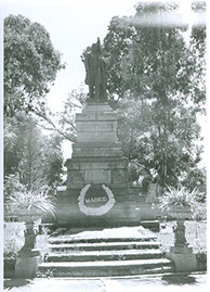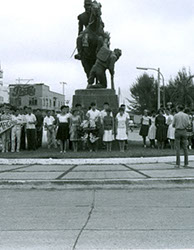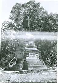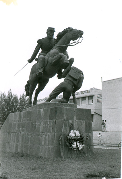 1962Foto de un monumento, un hombre caballo y otro debajo. Hay un adorno floral.