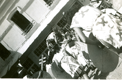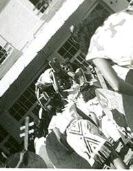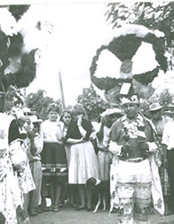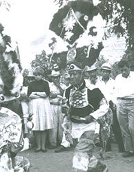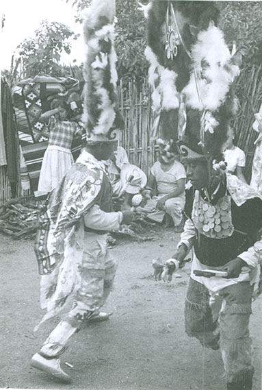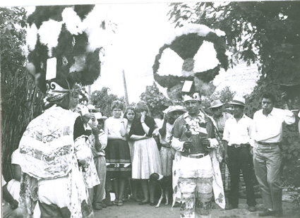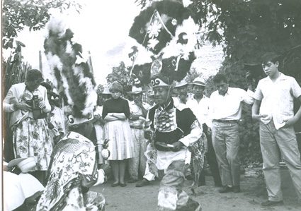 1960Dos danzantes con atuendos prehispánicos. Detrás un grupo de personas observando.