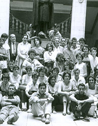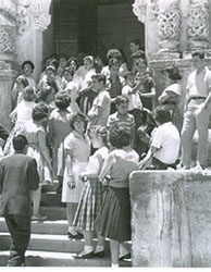 1962Foto de grupo de alumnos sentados en la escalinata de una construcción de piedra.
