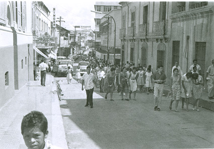 1960Grupo de alumnos caminando por la calle cuesta arriba. Hay edificios a los lados.