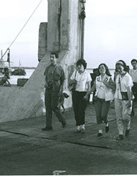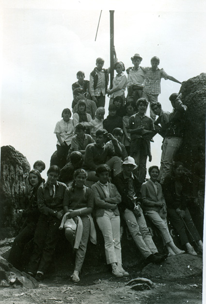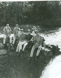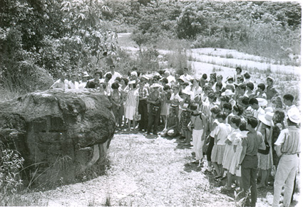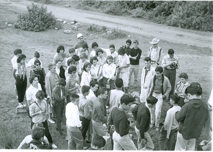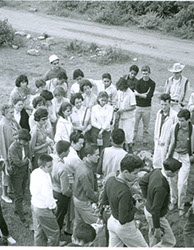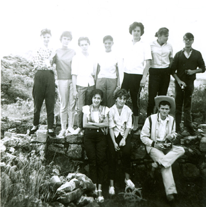 1961Grupo de alumnos observando una construcción de piedra.