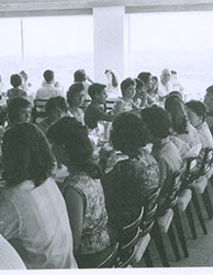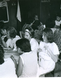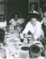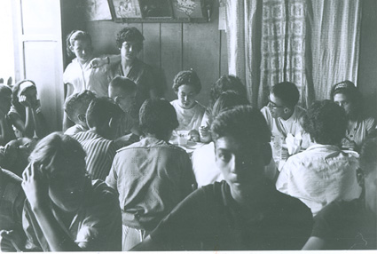 1962Grupo de alumnas dispuestas en mesa para comer.