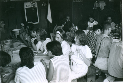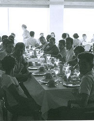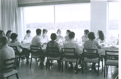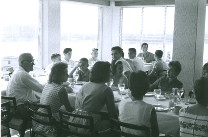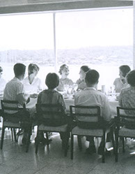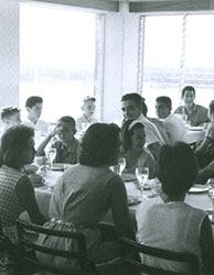 1962Vista de alumnos sentados en una mesa de comedor, de fondo se observa un lago.