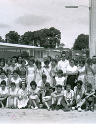1960Grupo de alumnos fotografiados afuera de una construcción.