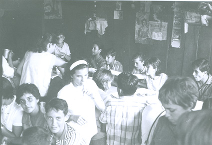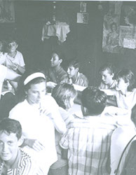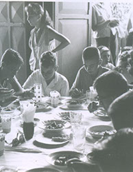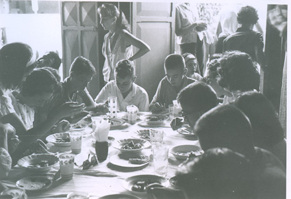 1961Vista de un grupo de chicos sentados en una mesa comiendo.