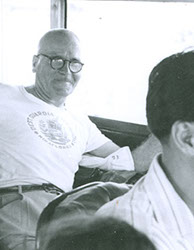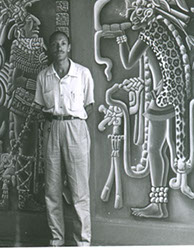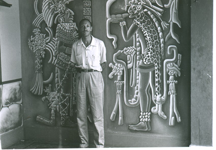 1962El maestro Eduardo Gorraéz delante de una representación prehispánica.