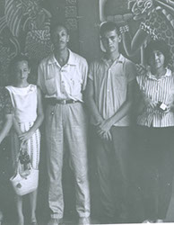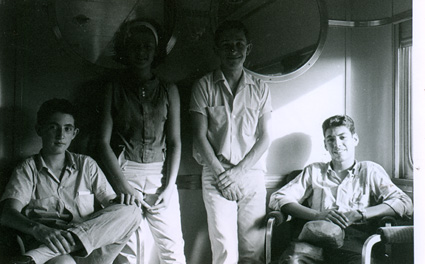 1962Dos chicos sentados, uno parado y una chica más fotografiados en una habitación.