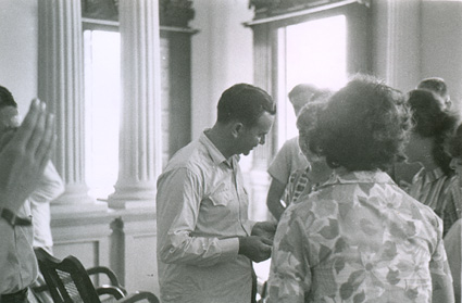 1962Grupo de personas platicando.