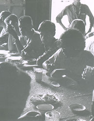 1961Vista de chicos dispuestos en mesas para comer.