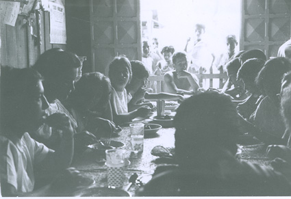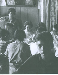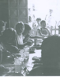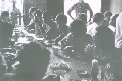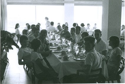 1962Grupo de alumnos sentados en una mesa comiendo.
