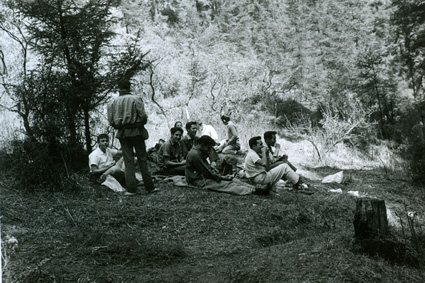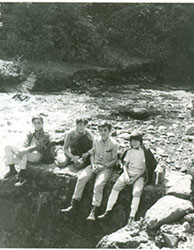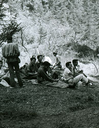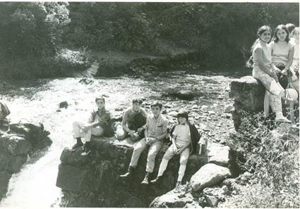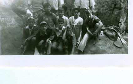 1951Grupo de chicos sentados en unas piedras grandes.