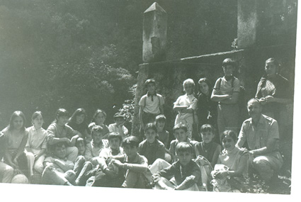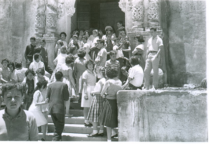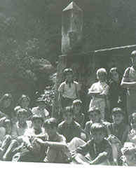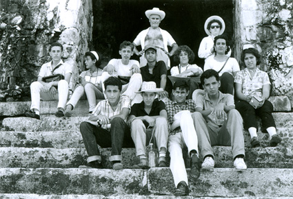 1961Grupo de chicos sentados en la escalinata de una construcción de piedra.