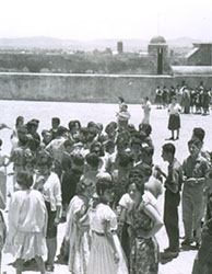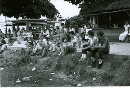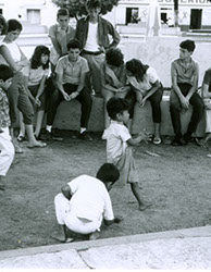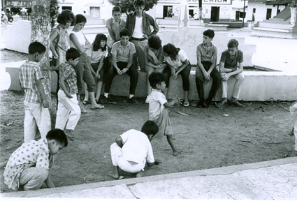 1961Grupo de chicos sentados en una barda viendo como juegan unos niños.