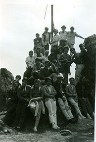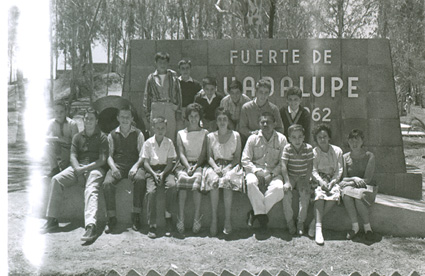 NO IDENTIFICADOGrupo de alumnos sentados en una construcción de piedra con una inscripción "Fuerte de Guadalupe".