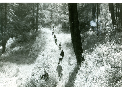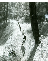 NO IDENTIFICADOVista de un bosque y de chicos caminando en fila.