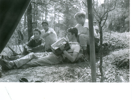 NO IDENTIFICADOCuatro chicos sentados en en el piso afuera de una casa de campaña, uno de ellos está tocando el acordeón.