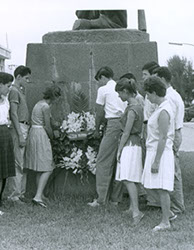 1960Grupo de alumnos haciendo guardia a los pies de un momumento. Hay un adorno floral.