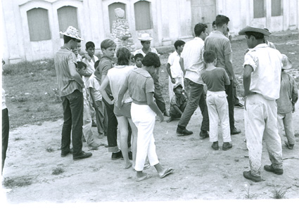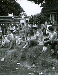 1961Grupo de chicos sentados en el piso, detrás se ven dos construcciones pequeñas, quiza sean una puesto de comida.