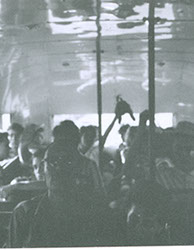 1961Grupo de chicos parados en un autobus, viendo por la ventana y tomando fotografías.