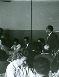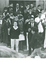1967El maestro Eduardo Gorraéz junto con alumnos hablando al microfono.