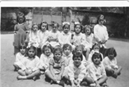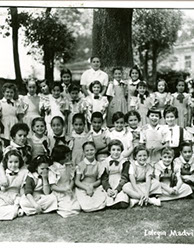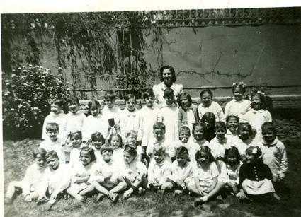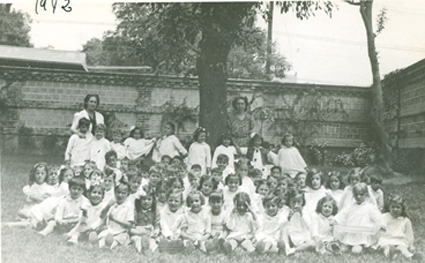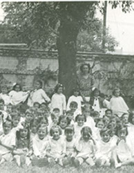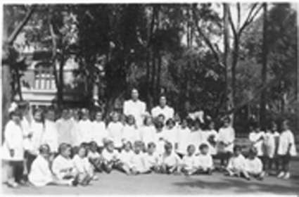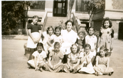 1942Foto de grupo de niñas sentadas en el jardín. La maestra esta presente.