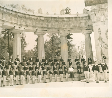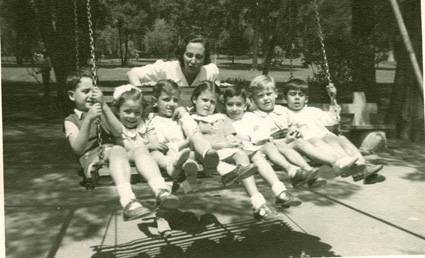 1942Alumnos de primaria sentados en un columpio metálico, junto Alicia Dìaz de Junquito.