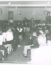 1962Vista de un salón con gente sentada en las mesas.