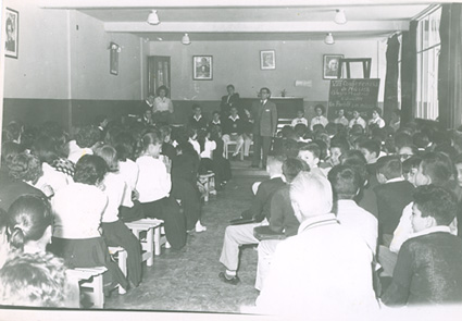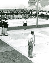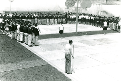1963Alumnos formados en la cancha de basquetball, el maestro Eduardo Gorraéz al micrófono.