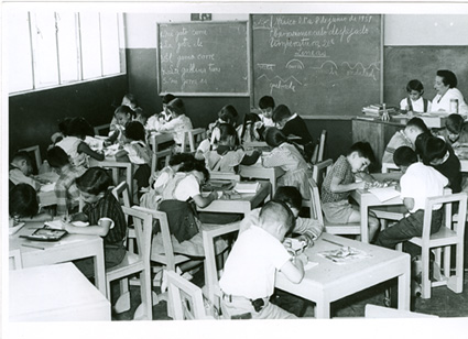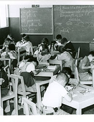 1959Foto de grupo de alumnos de primaria traajando en sus pupitres. La maestra está presente.