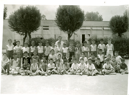 1943Foto de grupo de alumnos de primaria, están sentados en el patio.