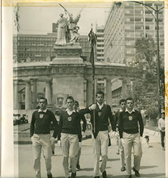 1961Foto de grupo de alumnos y MAESTROS en Yucatán, llevan un banderín del Colegio.